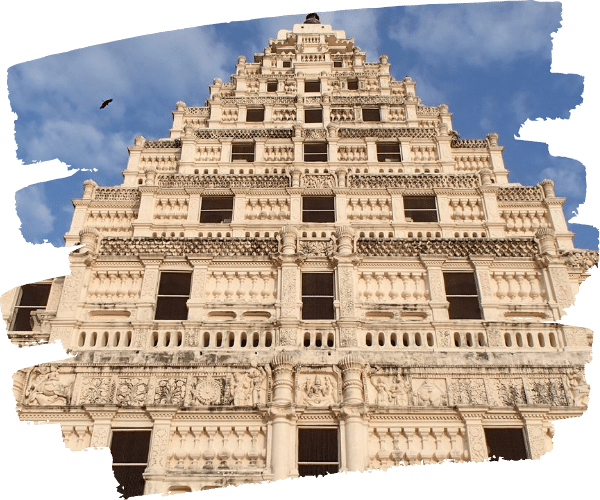 Not far from the temple and in the heart of the old tower lies the palace with vast labyrinthian buildings, enormous corridors, bit halls, watch-towers, moat, fort and courtyards. The palace was built by the Nayak rulers around 1550 A.D. and subsequently renovated and enlarged by the Maratha rulers of Thanjavur. Though a portion is in ruins, much of it is still in its original beauty.